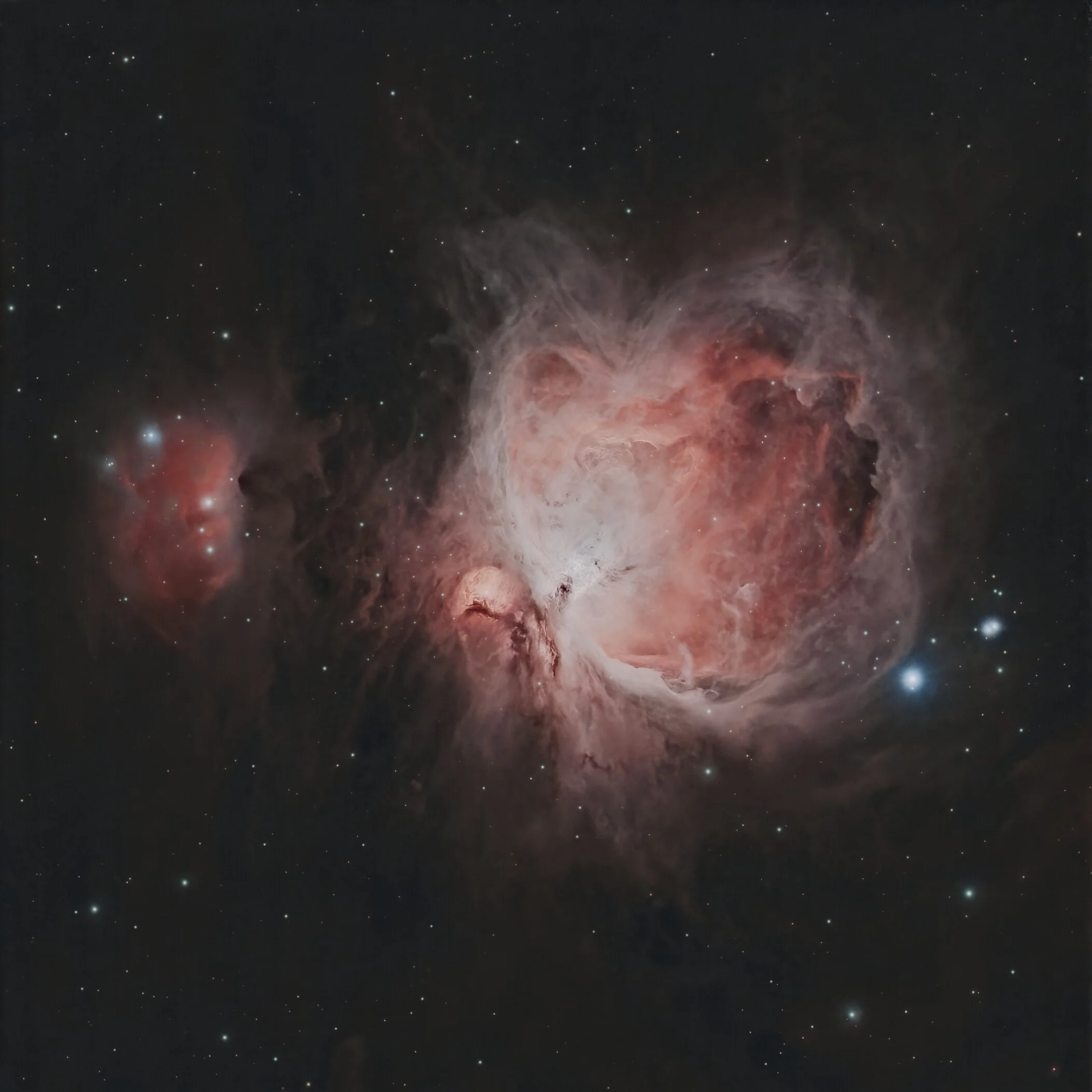 M42 is a region of active star formation. At its center, we can distinguish the Trapezium cluster, composed of relatively young stars, with ages between 300,000 and 1 million years. They are part of the star formation process underway in the nebula.