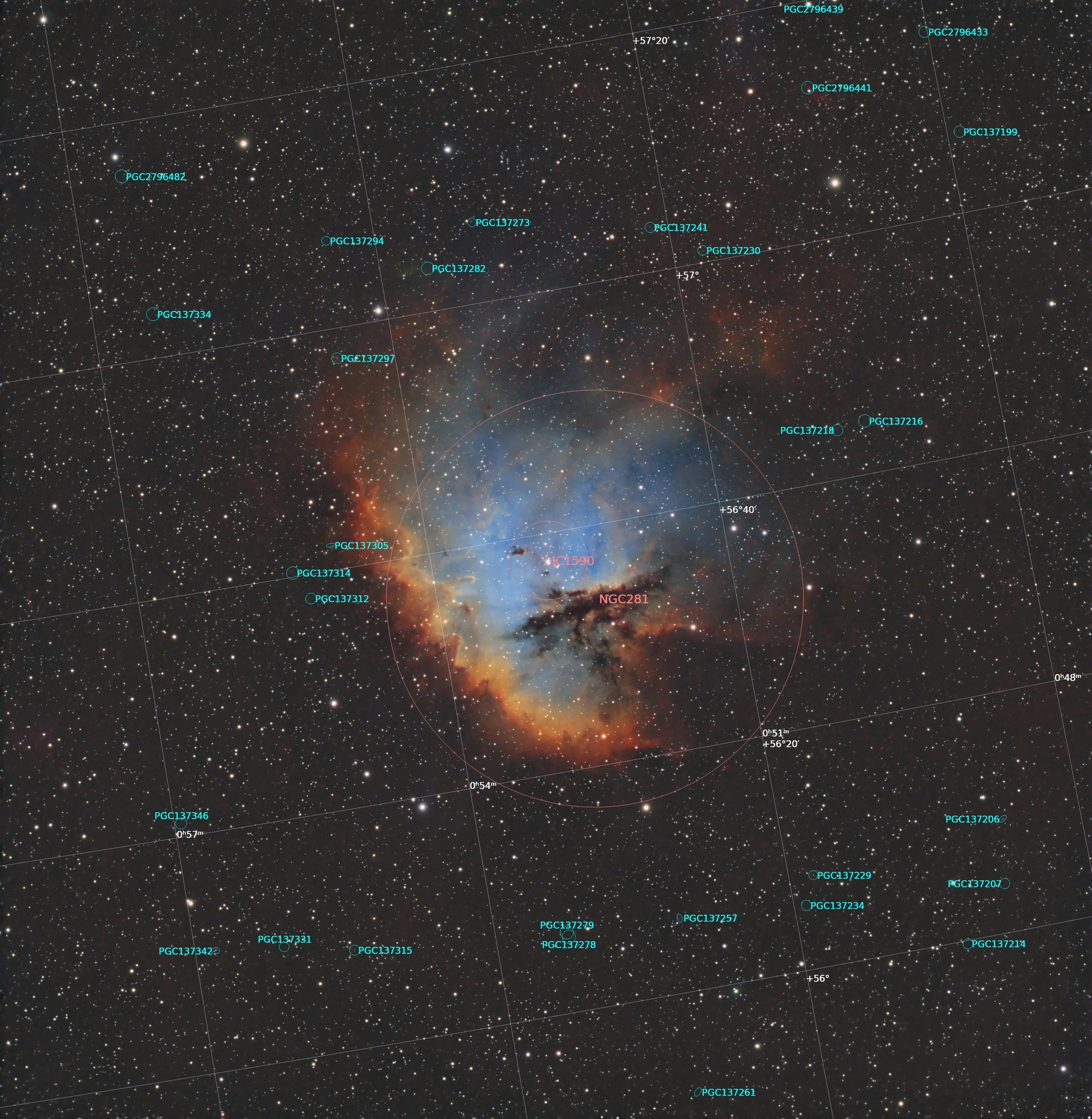 NGC 281 is an HII region located about 10,000 light-years from Earth in the constellation Cassiopeia. With a diameter of about 100 light-years, it is part of the Perseus Arm. It includes or is close to the open cluster IC 1590, the double star HD 5005, and several Bok globules. It is visible with an amateur telescope in areas where the night sky is sufficiently dark.