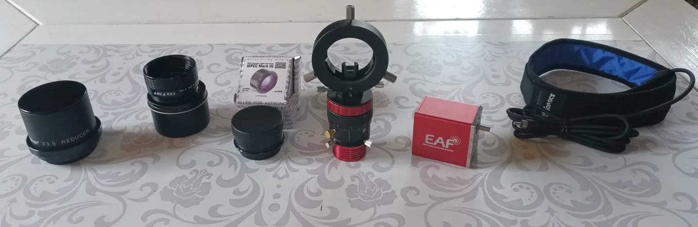 From left to right : Askar focal reducer x0.70 - Focal reducer Antares x0.63 for Celestron C8 - Coma Corrector Baader MPCC MK III for Newton - Off Axis Guider - Electronic Auto Focuser - Dew heater for Guidoscopes & Telescopes